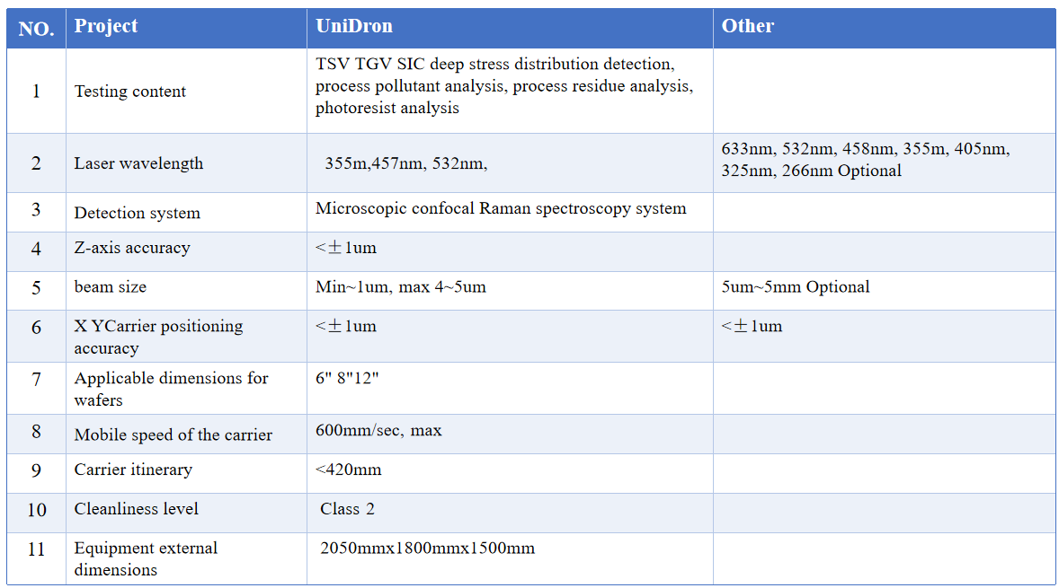 Main functions: semiconductor material SI SIC, etc. Compatible size: 6-inch-12-inch wafer or spindle Single Raman spectroscopy detection equipment integrates XRD stress analysis + SIMS ion detection + FTIR organic matter analysis function It has the detection of non-destructive deep stress distribution, process residue analysis and doping concentration analysis. |